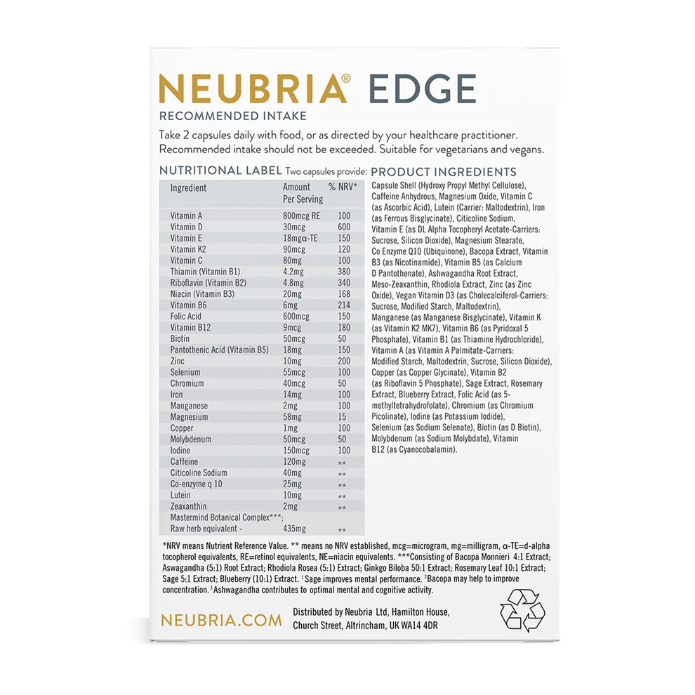 A Neubria Edge innovatív formulája vitaminok, ásványi anyagok és növényi kivonatok gondosan összeválogatott keverékét tartalmazza, amely támogatja az agy energiaellátását, a koncentrációt és a kognitív rugalmasságot. Ideális mindazok számára, akik szeretnék maximalizálni szellemi teljesítményüket.